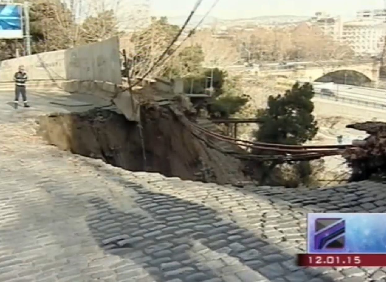 В Тбилиси, на подъеме Элбакидзе обвалилась часть мостовой. Сегодня, около 11:00 произошёл обвал проезжей части на улице Элбакидзе, в следствии чего движение транспорта в данный момент запрещено в обоих направлениях. На месте мобилизована патрульная полиция, которая призывает население покинуть территорию, ибо существует опасность обвала остальной части. По имеющейся информации никто не пострадал.