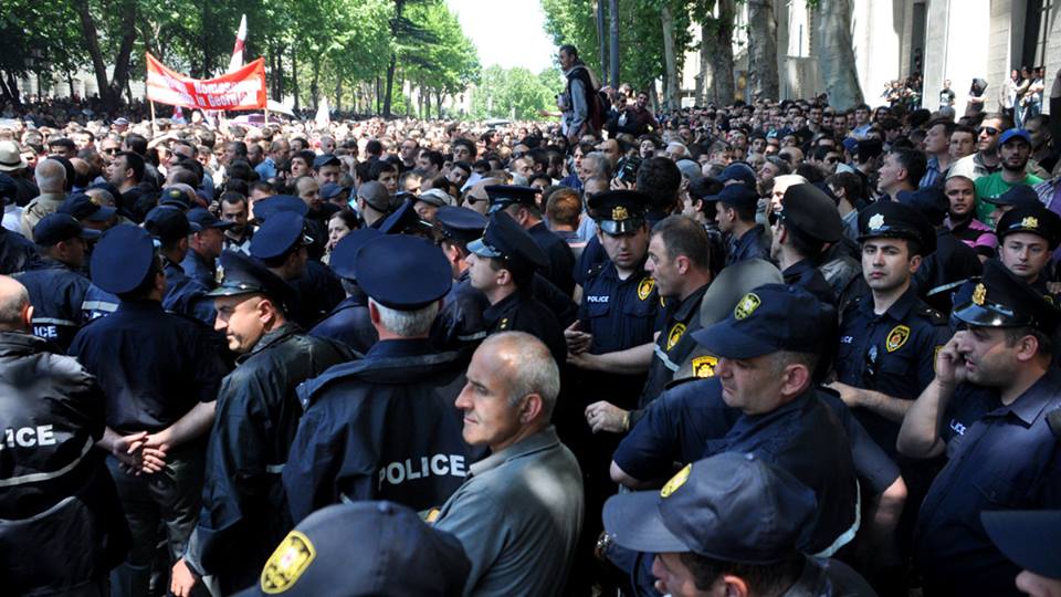 Несколько десятков человек с плакатами и флагами Грузии и Украины собрались у всех входов в здание парламента и требовали отставки кабинета министров, в первую очередь, министра финансов Нодара Хадури.