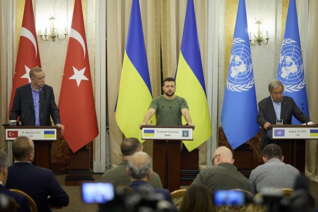 Президент Украины Владимир Зеленский, президент Турецкой Республики Реджеп Тайип Эрдоган и Генеральный секретарь ООН Антониу Гутерриш в ходе трехсторонней встречи во Львове обсудили экспортную зерновую инициативу, опасные действия России вокруг Запорожской атомной станции, вопросы защиты и освобождения украинских пленных и создания Специального трибунала по преступлению агрессии против Украины.