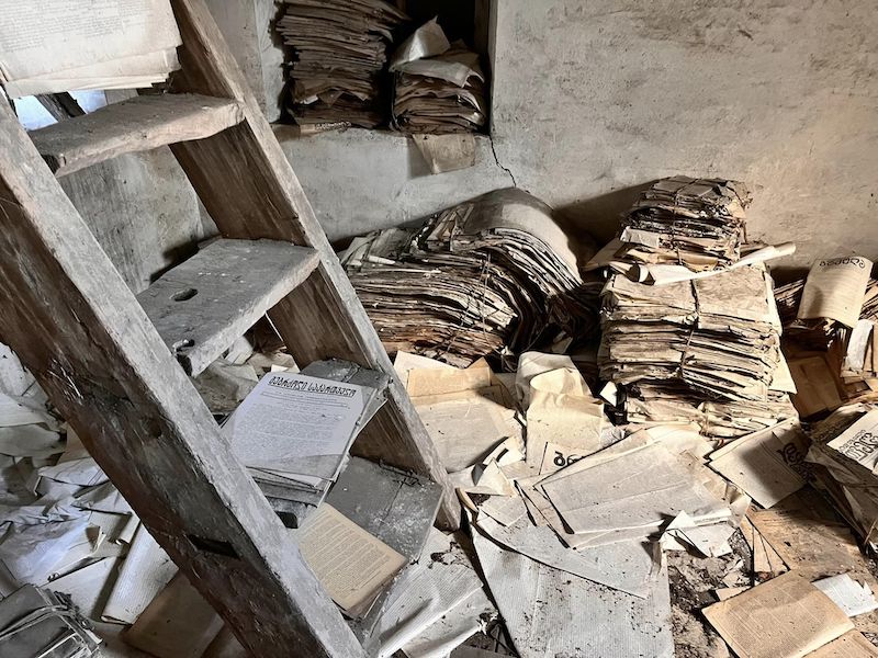 На них видны запыленные и испорченные водой документы, книги, журналы, часть из которых лежит на полках, а другая – на полу. Все это, по словам Вахтанга, было снято в библиотеке поместья.