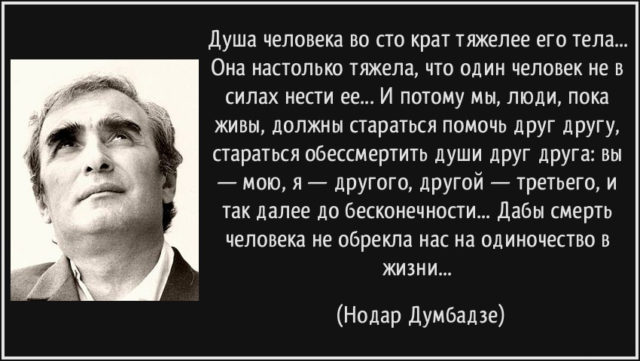 …В официальной обстановке я встретился с Нодаром в последний раз в день, когда в Союзе писателей Грузии мне вручали диплом и нагрудный значок лауреата премии имени Иванэ Мачабели. Председатель Союза писателей Нодар Думбадзе прикрепил мне к лацкану пиджака лауреатский значок, передал папку с дипломом, обнял, расцеловал и шепнул на ухо: «Брат мой, да бог тебе мира и добра в жизни…» …Нодара нет в живых. Но он всегда будет с нами, с нашими детьми, нашими внуками, с нашим народом и страной. Не суждено забвение его Зурикеле и бабушке, Илико и Иллариону, Авто и Теймуразу, Анатолию и Щербине, Бачане и Зазе, Кукараче и Геворку — людям, которых он любил, и которые принесли Нодару любовь миллионов…».